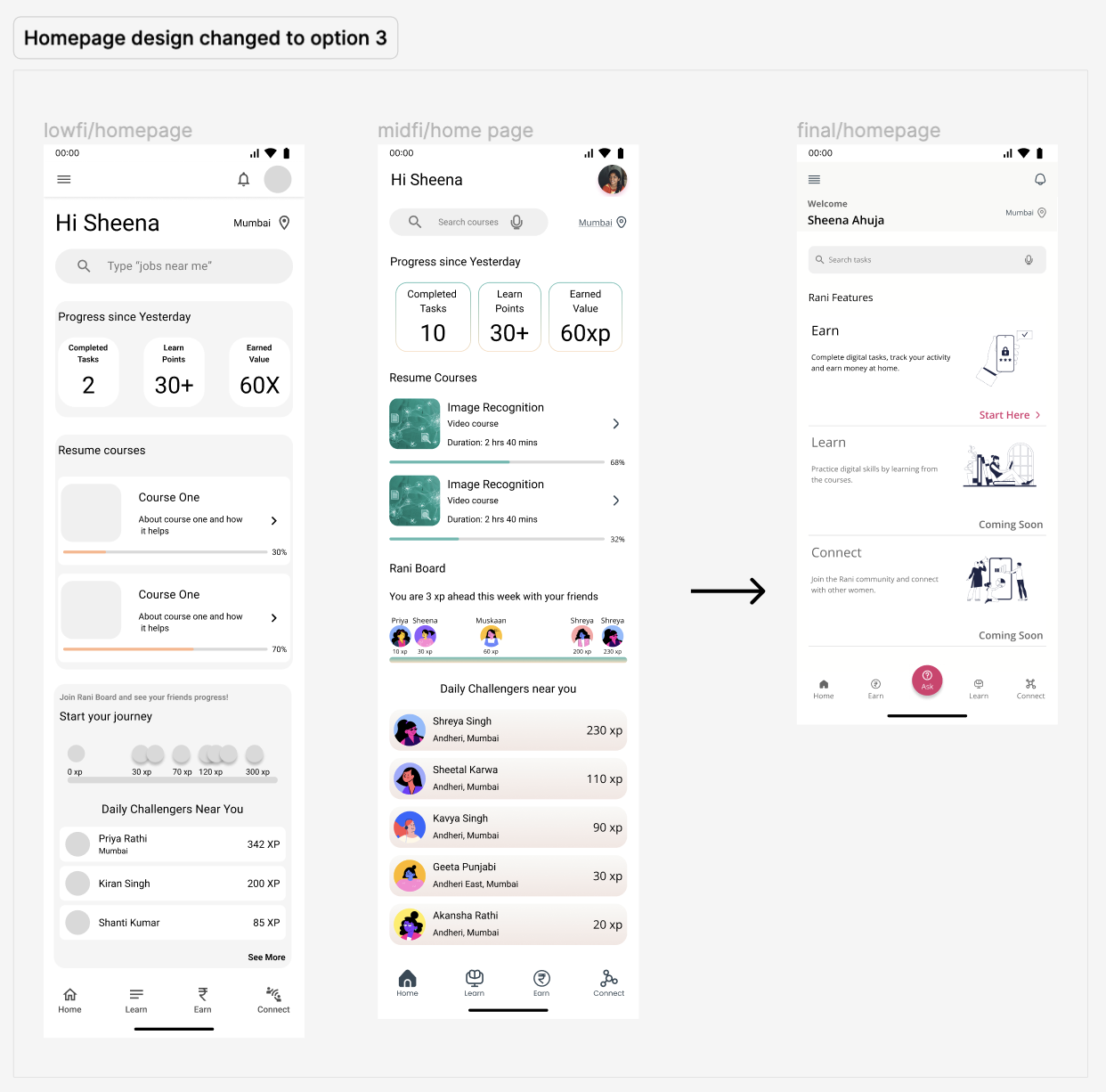 Design iterations on low-fi wireframes. Click here to view them.