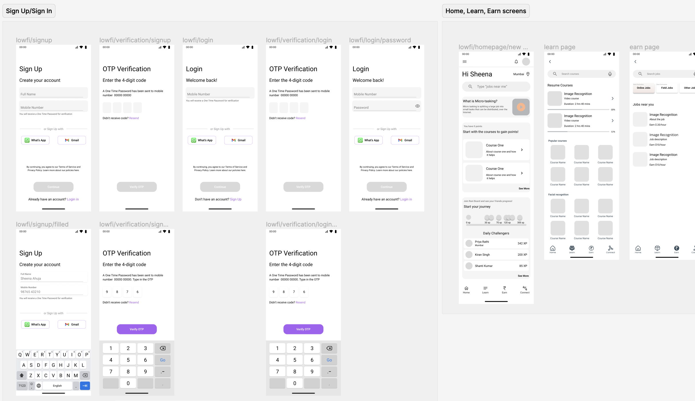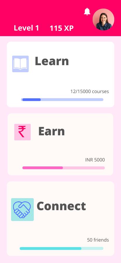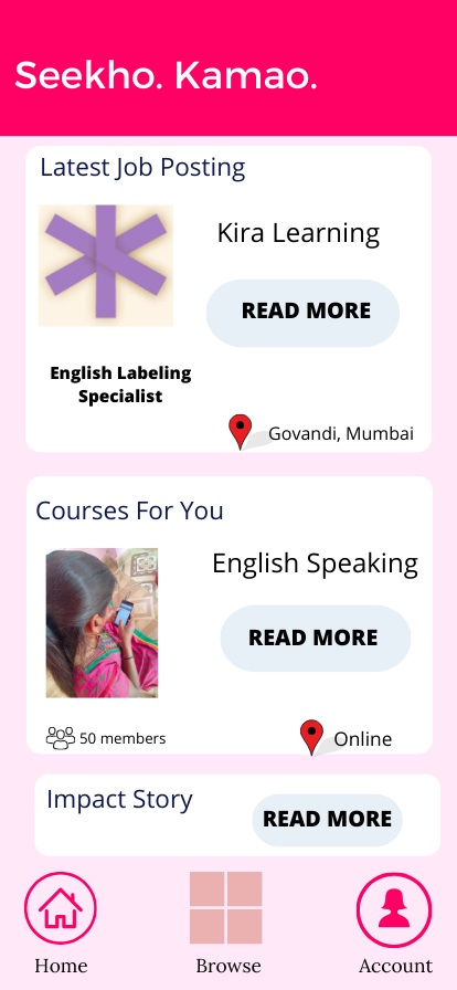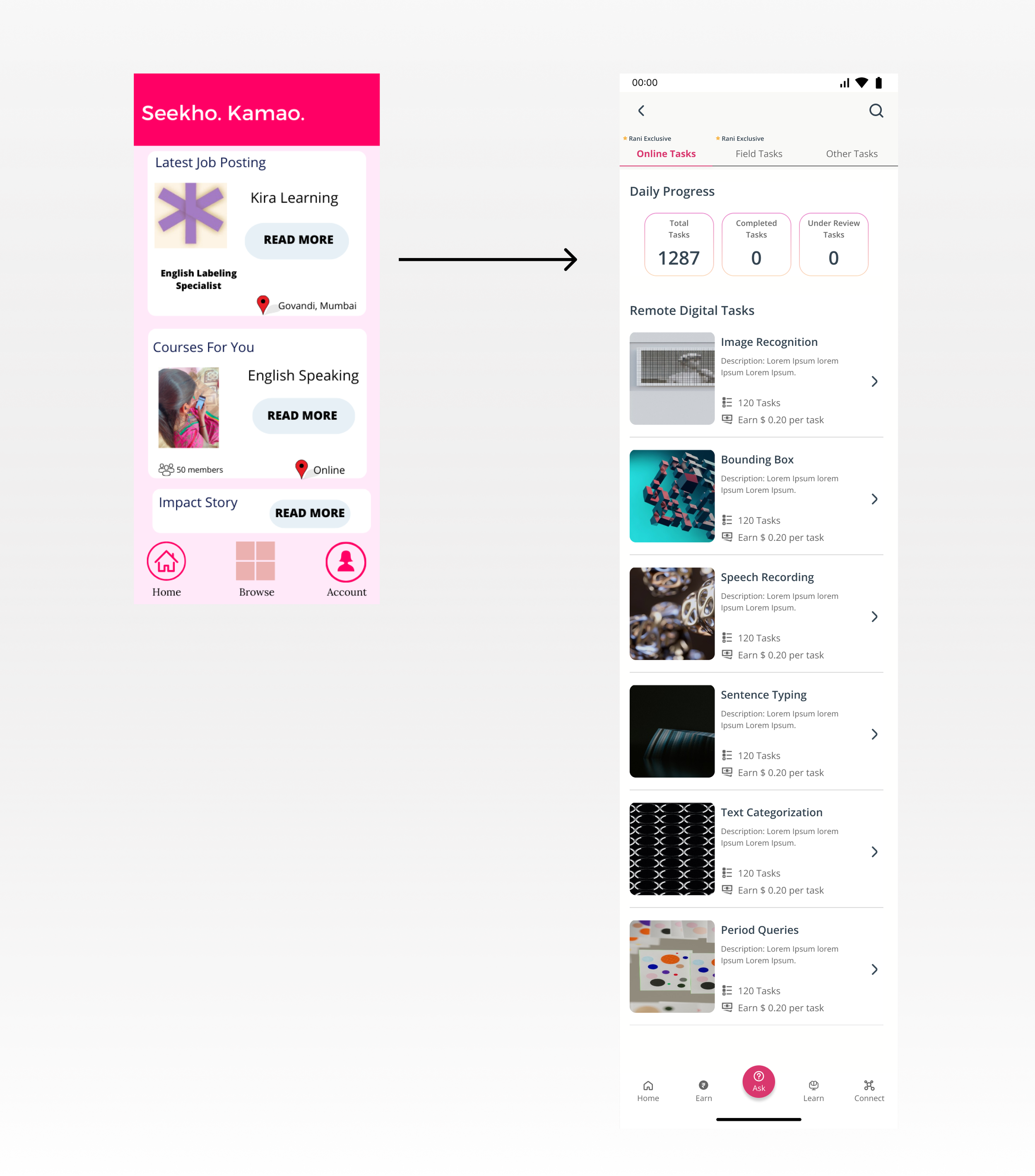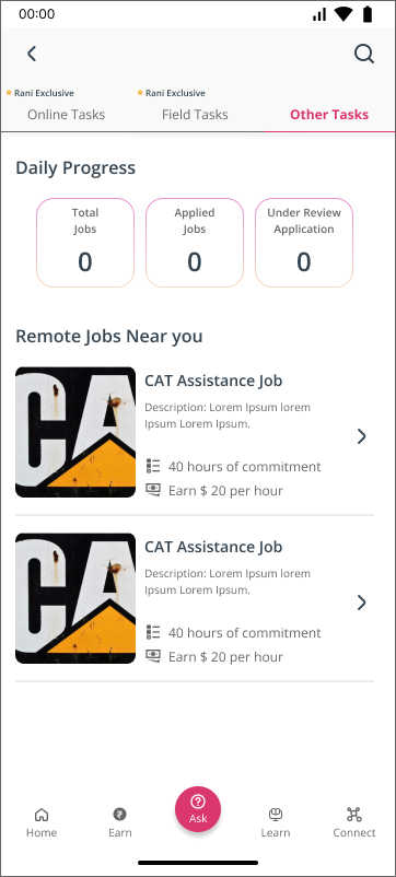 The online jobs and course learning were separated into the respective sections under the “Learn and “Earn” pages.