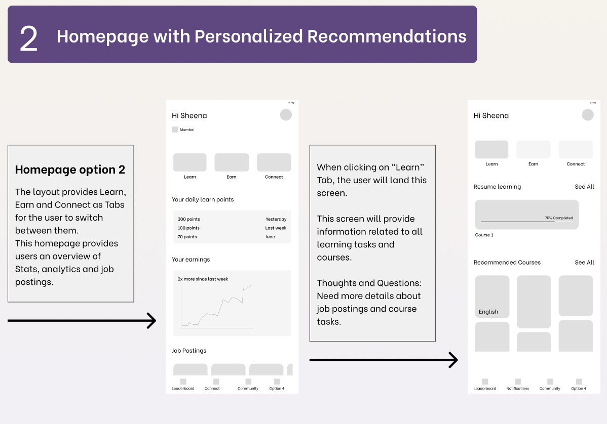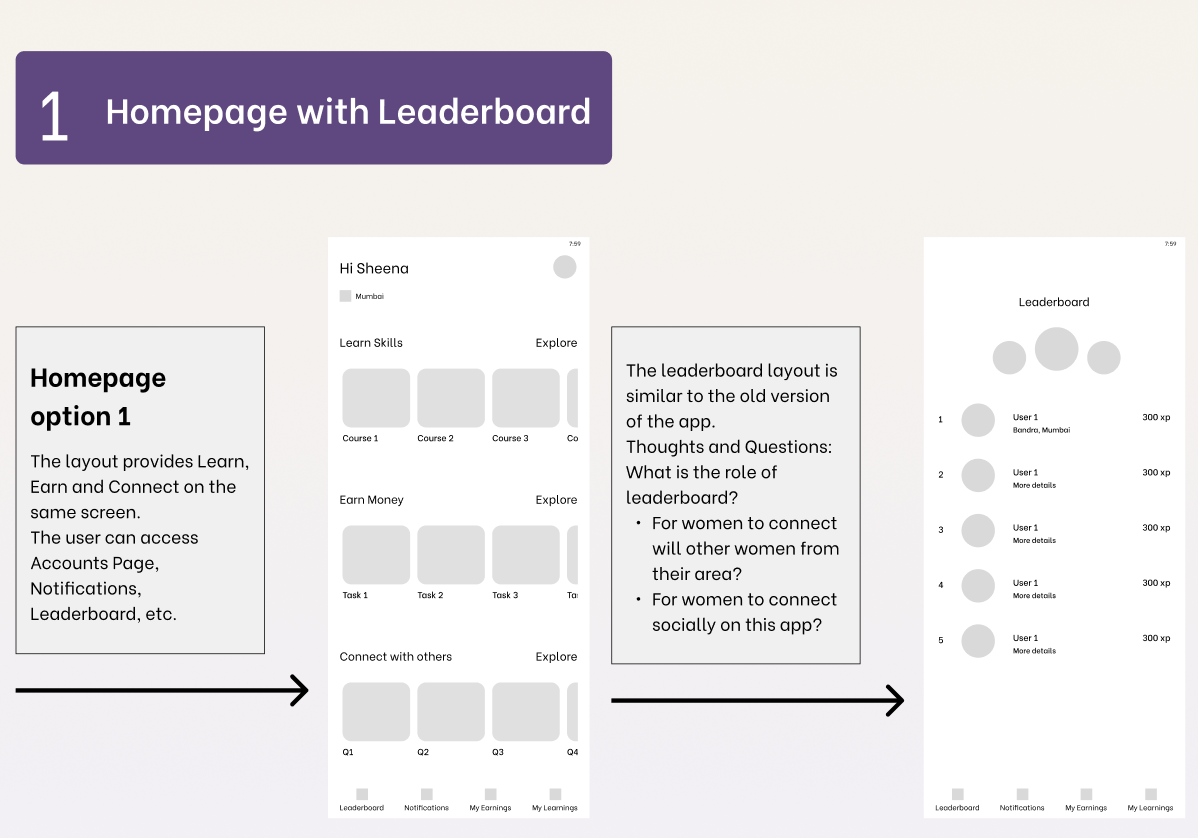 I presented the team with three homepage layouts aligned with their vision for the app and its functions. Guiding the team through these layouts, we evaluated the feasibility of the design in the absence of a solid foundation for the app structure and specific user data points.